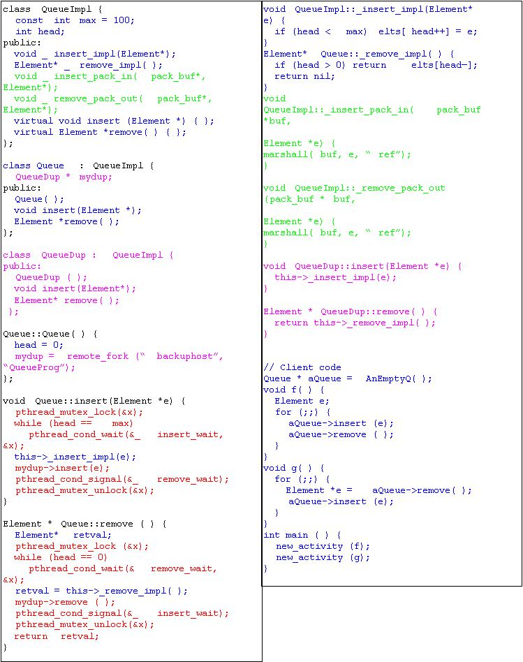 This example shows the power of the aspectual decomposition and AOP. The aspectually decomposed program is easy to write, maintain and reason about. Design and implementation of the weaver is moderately straightforward. The output of the weaver, that is the automatically tangled code, is quite efficient. (The tangled code is shown in Appendix 4.)