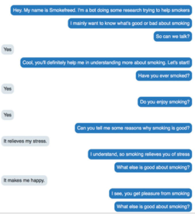- F. Almusharraf, P. Selby and J. Rose, "Engaging Unmotivated Smokers to Move Towards Quitting: Design of Motivational Interviewing-based Chatbot through Iterative Interactions," J Med Internet Res, November 2020; 22(11):e20251.