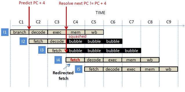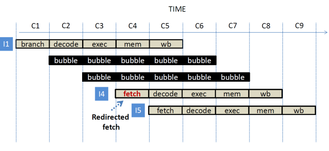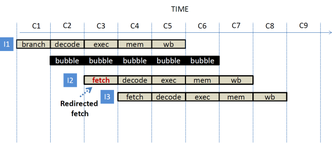 instructions I2 and I3 are squashed inducing two bubbles in the pipeline while