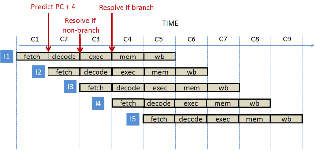 Waiting to determine where to fetch the next instruction induces stalls in the pipeline. In particular, one cycle stalls are induced for all but control flow instructions, and two cycle stalls are induced for control flow instructions.