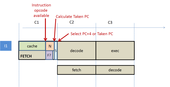 Instead of making the fetch stage long enough to accommodate the calculation of taken PC plus the decision as described, we can instead use a pre-decoding approach. In this approach, pushes the calculation of the taken PC plus the decision as to whether a branch is forward of backward just before the instruction cache. In particular, when a instruction is fetched from main memory, a hardware unit inspects the contents returned from memory, determines whether the instruction is a branch and if so, what is it’s taken address. This is metadata information is stored along the instruction in the instruction cache using extra bits that are invisible to the programmer. Eventually, when the pipeline fetches this instructions it gets both the taken address and whether this is a forward or not branch directly from the instruction cache. Accordingly, it can redirect fetch for the next cycle. This approach essentially moves the taken address calculation and the forward/backward calculation off the fetch stage and pushes it before the instruction cache. Since memory latencies are typically large (in the order of tens or hundreds of cycles) adding an extra cycle to do these calculations does not add much to the latency. Moreover, since the common case is that the pipeline will hit in the instruction cache, this one cycle overhead is paid rarely; once an instruction is pre-decoded and stored in the instruction cache, the pipeline does not to calculate and hence delay for the taken PC and the forward/backward determination. This pre-decoding technique can be used to hide other decoding-related complexities in the pipeline as well.