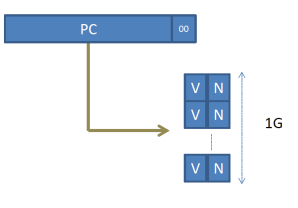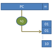 The implementation described might be straightforward to understand but is expensive. In particular, if we need one entry per possible branch, we will need 2^32/4, that is 2^30 or 1G entries for the 4G address space of NIOS II, since a branch can appear anywhere in memory. Each entry would contain a full PC (that’s 4 bytes) plus two more bits. That is a lot of storage and more than our main memory. But wait, if we are going to have an entry for each possible PC then we do not need to store the PC value in it. Starting from a PC, we can simply index the corresponding prediction table entry and get the valid and prediction bits. So instead of having a table like this: