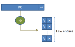 For example, the table can have 2K entries only. The hash function needs not be something overly complicated. For example, for a 2K entry prediction table, we can use just the lower 11 bits (after ignoring bits 1 and 0 which are always 0 as the instruction needs to be aligned at a 4-byte granularity).