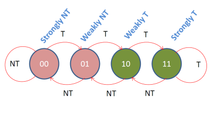 The diagram shows how the counter changes value according to the actual direction of the branch. The labels on top of the arrows show the actual branch outcome. For example, assuming that the current value is 10 the predictor is weakly biased toward taken and will predict taken. If the actual direction proves to be taken, the predictor will be updated to 11 and will become strongly biased toward taken. If the direction is not taken, the predictor will be updated to 01 changing its decision for time and becoming weakly biased toward not taken.