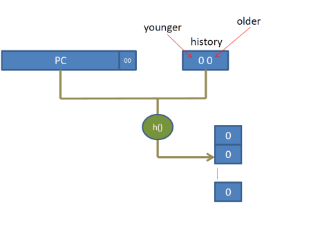 The idea behind pattern based branch predictor is to associate a prediction not just with a particular branch but also with a history of other related events. In particular, we can associate a prediction with both a PC and a series of recent branch outcomes. This is pattern-based prediction. In this prediction a shift register is introduced. Each bit corresponds to the direction taken by the N most recent branches. Each time a branch is predicted, we shift the register by one bit to the right and add an extra bit with the direction predicted for the current branch. To make things easy to understand, let’s pretend that the only branch that we were to observe at runtime was the J branch above. How will the prediction proceed? Let’s assume that we had a 2 bit history register and that initially the register is all zeroes corresponding to NT. Let’s see at three invocations of the inner j loop above. In this example assume that the only PC that will access the prediction table is the “J branch” and that there are enough entries to store all possible patterns. When indexing the prediction table we use both the PC and the pattern as specified by the history register. This can be done for example by concatenating the two (this is called a gselect predictor) or by hashing them together somehow through say some xor function (this is called gshare):