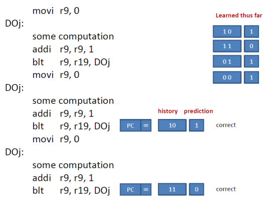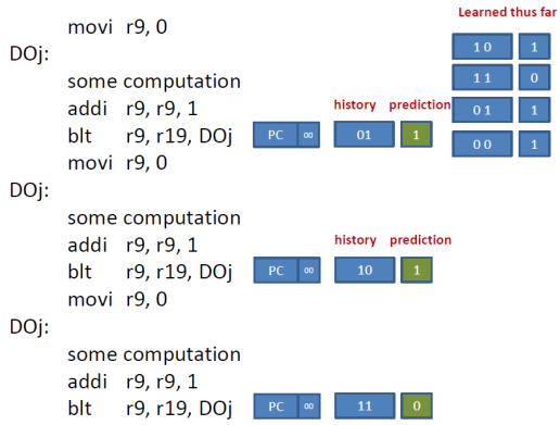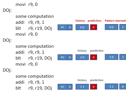 In our loop example, let’s assume the predictor for blt is initially weakly biased toward taken. The first loop iteration will correctly predict taken and will then move to be strongly biased toward taken. For the next 98 iterations it will predict taken and stay at 11. For the 100th iteration it will miss-predict and move to 10, weakly biased toward taken. Next time the loop starts executing it will correctly predict the first iteration and thus avoid the extra miss-prediction that the last-outcome predictor suffered. While for a loop that iterates 100 times the difference in accuracy is minor, for shorter loops avoiding that extra miss-prediction is significant.
