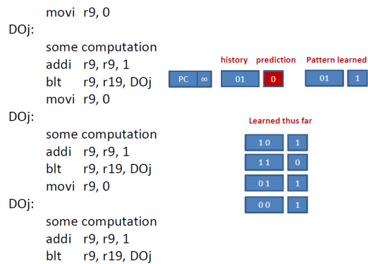 The first time the J branch executes, the history register contains 00 and the prediction is NT. This is assuming that all entries in the prediction table are initialized to NT. The predictor miss-predicts and when the J branch executes eventually, the predictor learns that the history pattern 00 leads to T. The history register is updated to 10, since the last branch that was since was taken. The second time the branch executes, it again resorts to the initial value provided for the history pattern 10, which incorrectly set to NT. It miss-predicts and learns that 10 leads to T instead. The history register is now 11 since the last two times J was taken. The third time, the predictor correctly predicts NT just by luck as the default initial value is NT. It also learns that 11 leads to NT. History is updated to 01, since the last branch was not taken and the previous to last was taken. So far our predictor has learned three patterns: 00 à T, 10 àT, and 11 à NT.