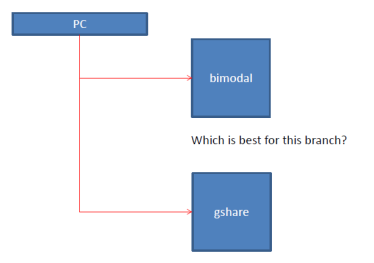 As the example has shown, it takes a while for a pattern predictor to learn how a branch behaves. It may be more capable than a simple bi-modal predictor but it takes a while to do so and uses many entries. In summary, bi-modal is a fast learner but it can only learn so much, gshare/pattern is clever but it takes a while to light the fuse. Enter tournament predictors. These predictors try to get the best of both worlds. They run in parallel say a bi-modal and a gshare predictor and then try to pick the best of the two: