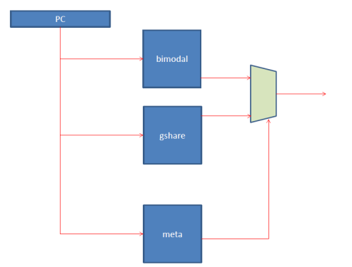 The first two predictors observe the branch stream, PCs and taken or not taken and operate as we described. The third, meta predictor observes the other two and in particular whether they are wrong or right. It adjusts its decision toward the one that is right (breaking ties either way probably preferably toward the bimodal which is more space efficient). Most high-end processors today implement some variant of this tournament predictor.