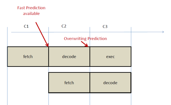Branch predictors operate under very strict time constraints. They have to make a decision within a single clock cycle in order to be able to continuously feed the pipeline with new instructions. Branch prediction accuracy can increase considerably if larger tables are used since this reduces aliasing and allows us to learn more patterns. However, larger tables are slower. As a result, processors are often use very small predictors that are not as accurate as we would wish. If someone is willing to pay the price, there is a better solution where two predictors operate in parallel. The first is a fast that operates within a single clock cycle. The second is a much larger, overwriting predictor that may take multiple cycles to make a prediction. For example, in our 5-stage pipeline, the overwriting predictor may take two cycles and produce a better prediction by the end of decode: