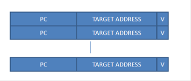So far, we were concerned with predicting whether the branch will be taken or not. If it’s taken it would be nice to know where it goes to. We said that one option is to calculate this at the fetch stage at the cost of making the clock cycle slow enough to accommodate this calculation. An alternate approach is to predict the target address. A simple last-outcome predictor can be used here as well. That is, the first time we see a branch we take our losses and do not predict the taken address. However, once the branch executes and we see which is the taken address we store it in in a separate Branch Target Buffer table (BTB). Next time around, we encounter the same branch we look it up in the BTB using just its PC where we will find its target address. To avoid aliasing we can tag each entry with the PC that it corresponds to: