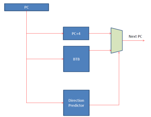 In summary, the fetch stage contains a branch direction predictor and a Branch Target Buffer which operate in parallel. The branch direction predictor provides a taken/not taken prediction and the BTB provides the taken address. In parallel we also calculate the fall through address (PC + 4) and select between that and the one provided by the BTB based on the direction prediction: