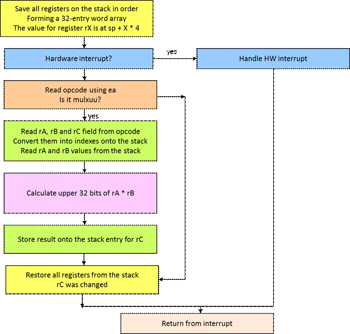 Here’s the assembly code for the interrupt handler. This code will not work when any of sp, et, or ea are used as the destination register for mulxuu.