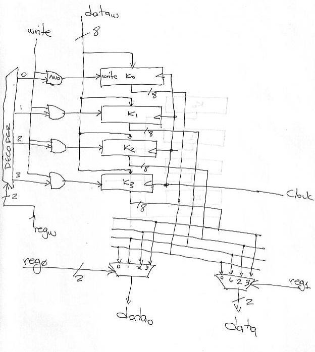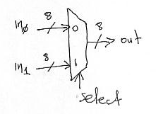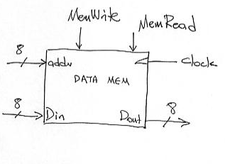 To perform memory stores and loads we need to introduce the data memory component. For stores we need to activate the MemWrite signal and drive the value of R1 (output 0 from the register file) onto the address lines and the value of R2 onto the data input lines of the data memory. For loads we need to active the MemRead signal, drive R1’s value onto the address lines (as we did for stores) and then grab the value that memory provides onto its data out lines and write it into R1. For the latter we need to drive R1’s name onto regw (something we already done for ADD and the rest) and drive the value from onto the data in lines of the register file. But because these lines are already driven by ALU out we also need to introduce a multiplexer to either pass ALUout or the memory out. Here’s the complete data path: