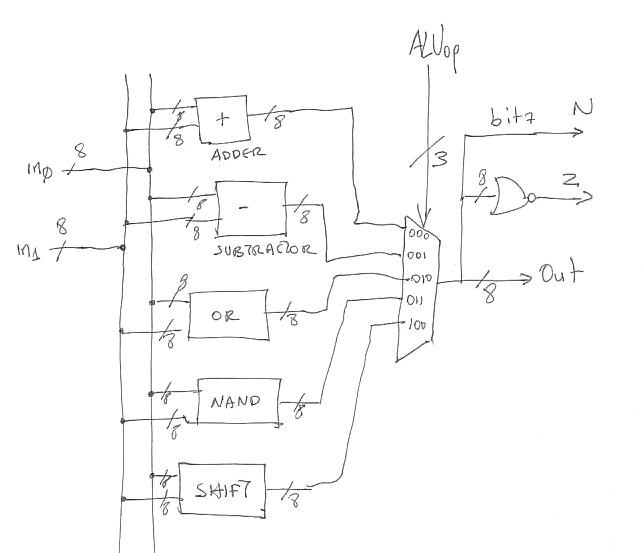This is very similar to ADD, SUB and NAND. The major difference is that the ORI instruction uses an immediate field as its second operand (i.e., it does not read two registers). So, we can augment our datapath to also support the ORI instruction by placing a mux in front of the second ALU input. This way we can select either the output from the register file or the Imm5 field from the instruction (wires INST7 through INST3):