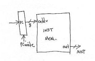 Notice that at this point in time the signals of the datapath and the control will have values which may be incorrect (they me correct only incidentally). So, because the PC is connected to the instruction memory the latter will start reading the contents of the memory location pointed to by the PC. After a while these contents will appear on the INST lines. After a while the control will produce the appropriate control signal values In the meantime, the register file may have been reading arbitrary registers, the ALU may have been producing arbitrary results. This is OK as it does not change any storage elements (registers or memory). Eventually, once the INST signals are set correctly by the instruction memory, the register file will see the right register names on its inputs and will after a while produce the appropriate values on its outputs. Because the control will eventually produce the appropriate values for all control signals we will eventually see the appropriate results out of the ALU, or from or to memory. Key to making the whole thing work correctly is that no storage element will change prior to the next falling edge of the clock. Thus if we make the clock slow enough there will be sufficient time to produce all appropriate values and then make the right changes instantaneously.