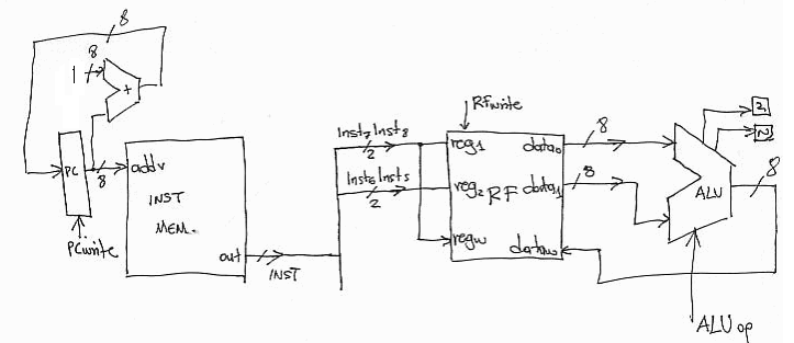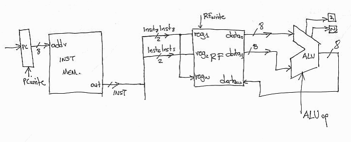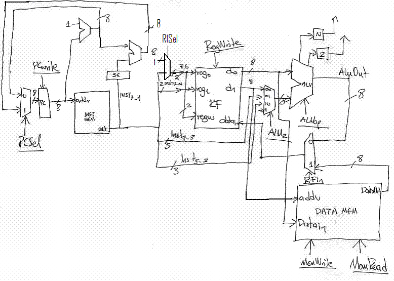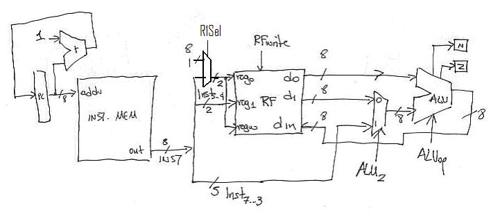 Notice that we introduced a MUX and a control signal ALU2. This way by setting ALU2 to 0 we can implement the datapath for ADD, SUB and NAND. If we set it to 1 we get the datapath for ORI. We directly connect the Imm5 field from the INST wires since it is there that it will appear. Finally, notice that we still read two registers from the register file. However, we only care for one of them (reg0). This is OK as reads are not destructive. If we wanted to avoid this we would need additional control signals in the register file to inhibit reads.