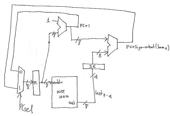 To implement branches we need to set PC to either PC+1 or to PC + sign-extend(Imm4). The Imm4 comes embedded into the instruction. We need to first sign extend this immediate to 8 bits. Here’s the “circuit”: