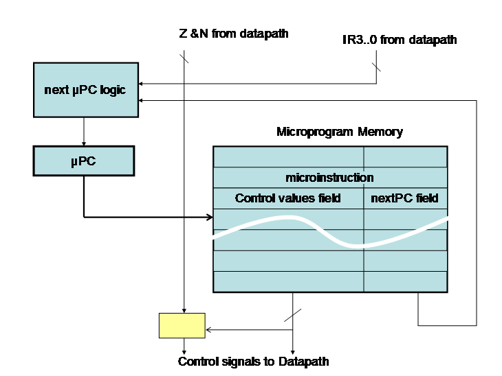 The microPC serves a dual purpose. Its value identifies the current FSM state. So, with it we can remember which FSM state we are at. It is also used as an address to read a row from the microprogram memory. The microprogram memory implements the other two functions of the FSM: setting values for the datapath control signals and the next state transitions. The microprogram memory remain constant while the processor is executing instructions. However, by changing its contents we can change the control FSM. So, this implementation allows some flexibility in changing the FSM.