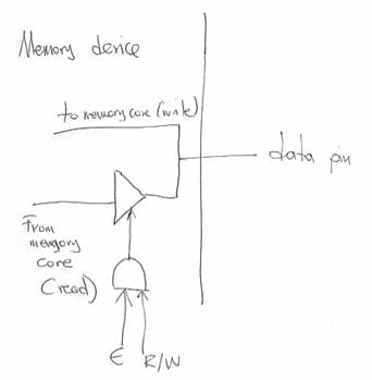 There is a tri-state buffer and a direct connection to the external data pin. If we are reading from the device (E AND R/W) then the tri-state buffer is enabled and the value read from the internal memory array is placed on the data pin. If we are not reading from the device, then the tri-state buffer is de-activated and the data pin is left floating. For writes, the internal memory core has a direct connection so that it can use the value placed there by someone else (typically the CPU). This arrangement allow us to connect multiple memory devices onto the same data pins. So long as we make sure that only one of them is driving the data line (i.e., we read from only one device) there is no short-circuit and everything works fine.