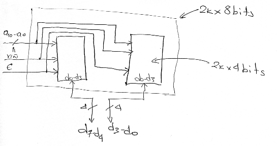 Having two of the smaller devices we must now connect them so that they collectively behave like the larger device. The idea here is to place the two small devices conceptually next to each other, access the same row in both devices and use the four bits from one of the devices as the four most significant bits of the output and the four bits from the second device and the lower four least significant bits of the output. The connections are as follows: