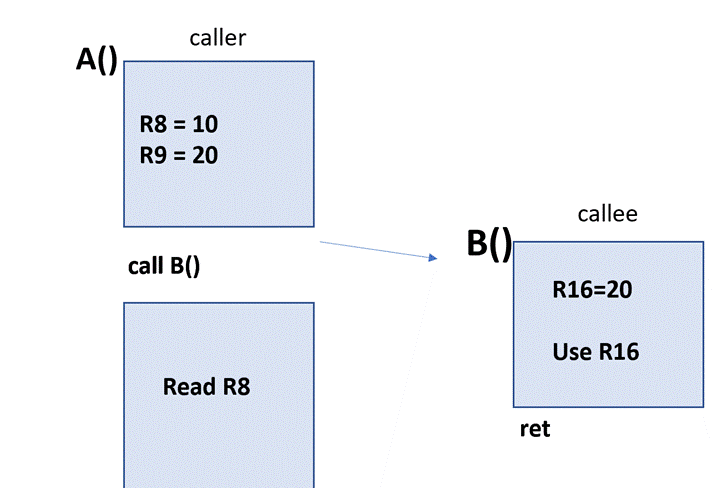 The Caller: A() has to ask itself: “is there a register that BEFORE I make the call to B() has a value that I might use AFTER the call returns?”. In the figure above, we show that r8 and r9 are set to 10 and 20 before the call to B(). After the Call returns, A() only uses R8 expecting that it will have the same value as it did before the call.