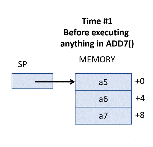 What add7() expects: Let’s first see where add7 expects its input arguments to be? That is, when add7() is called by whichever function it calls it, where does add7 can find a1 through a7.