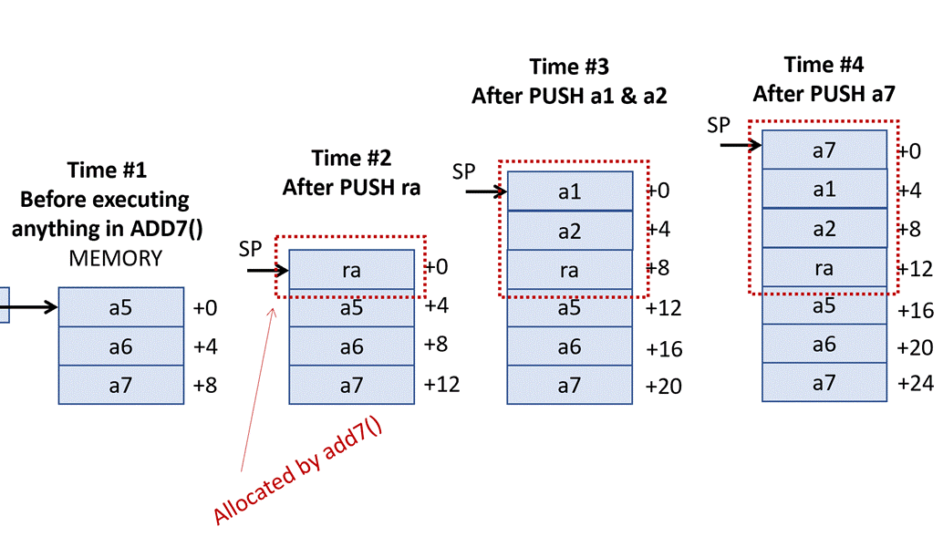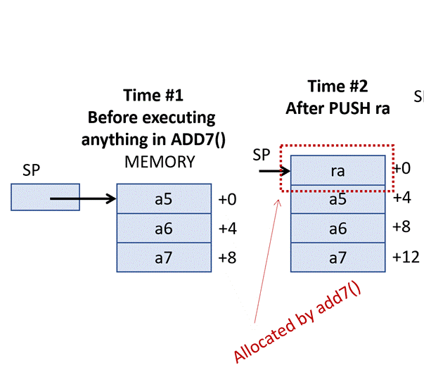 Accordingly, we can start filling in the blanks add7()’s implementation by pushing RA on the stack upon entry and popping from the stack (and thus restoring the value it had upon entry) prior to returning: