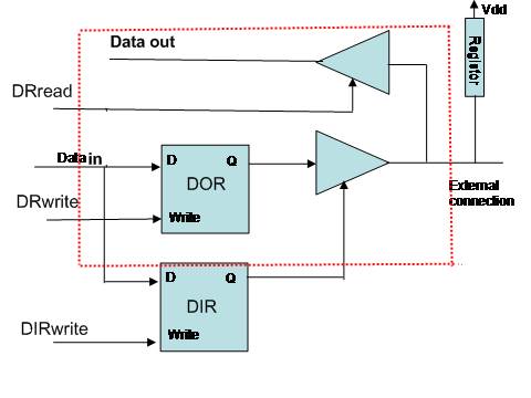 The DR register is implemented by the elements shown inside the red-dotted box. If DRread becomes 1 then the upper tri-state buffer is activated and passes the value on the external connection to the data_out wire. If DRwrite becomes 1, then the value provided on the data_in wire is written in the DOR bit. Provided that the DIR bit is also 1 this value appears on the external connection.