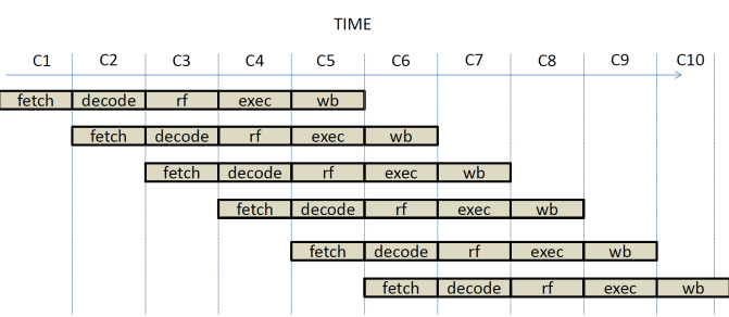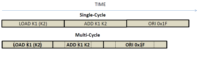 Thus far we’ve seen two different ways of implementing processors. In the first, and slower performing, each instruction took a single cycle to execute. In the second, multi-cycle implementation, each instruction took multiple, shorter cycles to execute. In either case, instructions execute in isolation in time as the time diagram below shows: