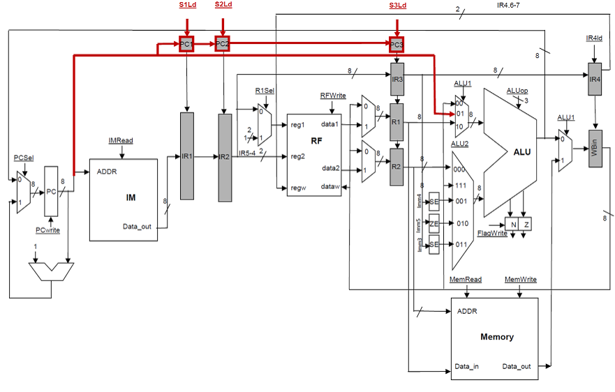 along with them in registers PC1, PC2, PC3 as they pass through the pipeline