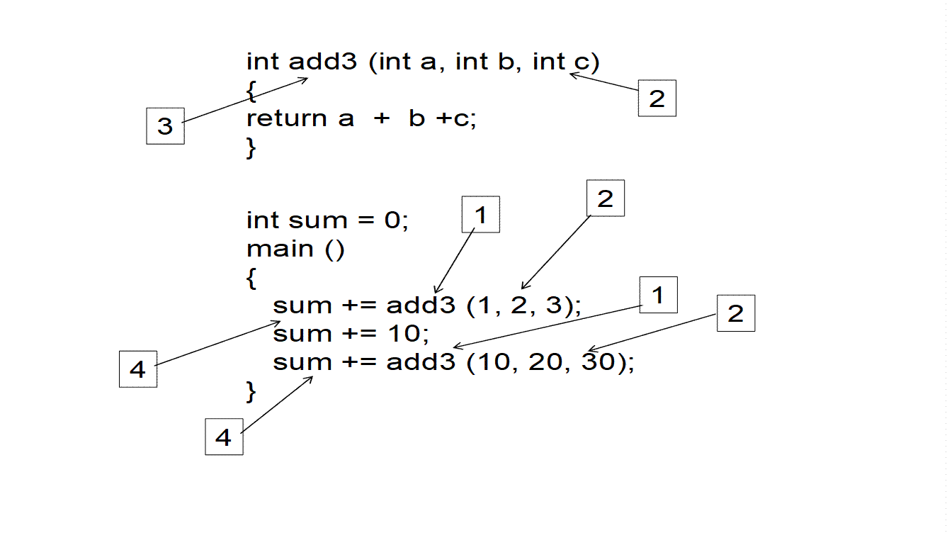 Structured programming relies on subroutines. Restricting our attention to C, we could write a subroutine that accepts three numerical arguments and returns their sum. This subroutine can then be used (or called) from many different places in our program. That is we could for example write the following in C: