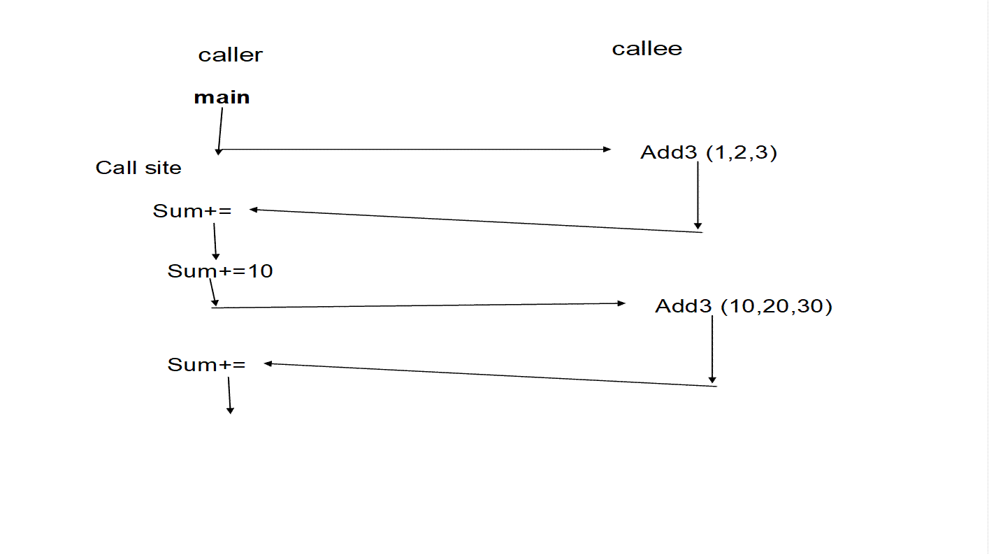 We can see that the add3 subroutine is called from two different places. The place a routine is called from is also referred to as a call site. The three parameters that add3 accepts take different values at each call site ((1,2,3) and (10,20,30)). Add3 “returns” a value which is the sum of its three arguments. So, every time add3 is called, it calculates a result and that result is returned as the subroutine’s value. This value can then be used in an expression (e.g., in add3(10,20,30) evaluates to 60). The first time add3 is called we expect execution to resume immediately after the statement that called it. So, once add3(1,2,3) returns execution will resume by adding the return value to sum. Then, the “sum += 10” statement will get executed. The second time add3 is called execution resumes immediately after the particular call.
