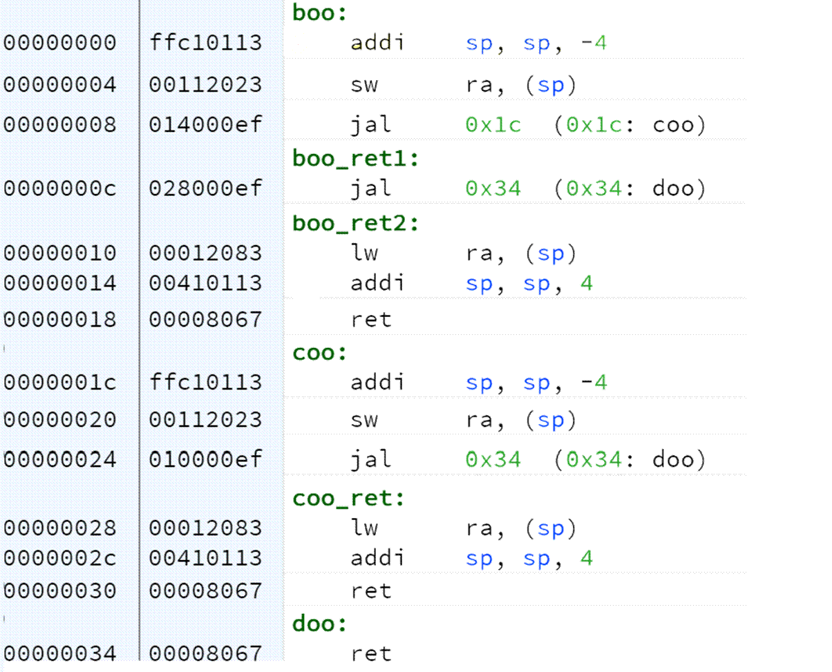 Back in boo, we then call doo. This changes the PC to point to doo while ra becomes boo_ret2 which is the address of the “call doo” plus four. Doo again uses ra to return to whoever called it. After doo returns, we go to boo_ret1. Finally, boo pops the saved return value from the stack and returns to whichever function called it.