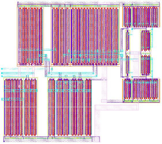 The two VDD supplies were separated by inserting two cuts into the padframe's VDD ring. They were routed to the circuit on the top-most layer, metal 7, while VSS was routed on metal 6. Signals were routed to the pads on metal 5 to minimize substrate coupling. Groups of input data and clocks were each first routed from the pads to a central point and then to the circuit to minimize skew.