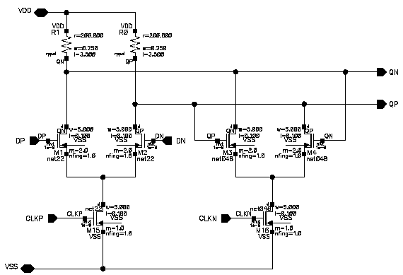 The phase detector, shown in Fig. 2 samples the data using three parallel master-slave flip-flops constructed with current-mode logic (CML) latches, one of which is shown in Fig. 3. The top path samples the data on the rising edge of the in-phase clock, the middle on the rising edge of quadrature clock, and the bottom on the falling edge of the in-phase clock. The third latch in the top two paths synchronizes all paths to the same clock edge. The two CML XORs, one of which is shown in Fig. 4, detect the phase difference between the sampled data and generate differential up and down pulses.