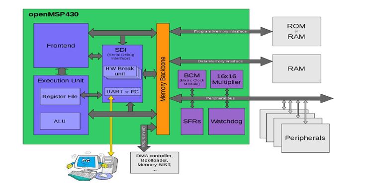OpenMSP430 is a 16 bit general purpose microcontroller, featuring low power consumption with clock gating technique [1]. Its architecture Figure 2 contains the following sub-blocks: