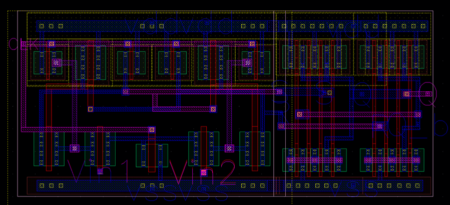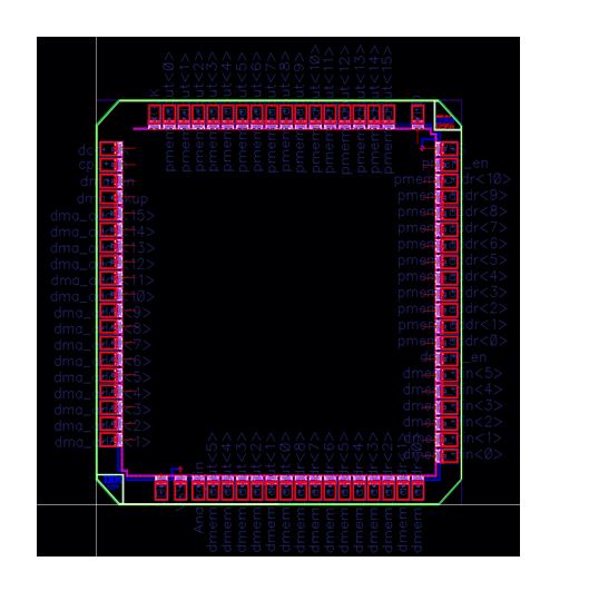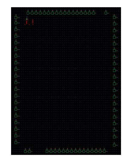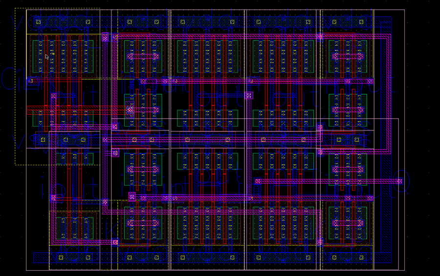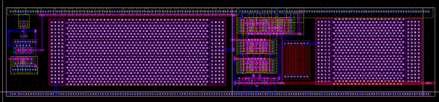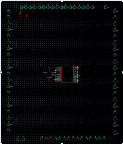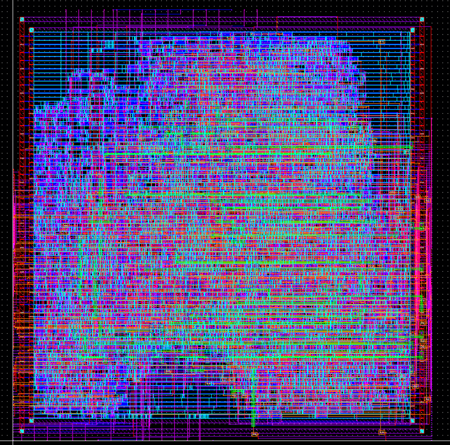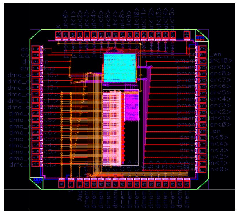 The complete layout including pads is shown in Figure 37. The total area of the design is 4mm^2(2mm by 2mm). The pad frame was designed using the PAD_P13 library, which includes 4 different pad types, GND, power, signal with ESD protection and signal without ESD protection. The pad frame of our design has 75 pads, including 2 GND pads, 2 power pads, and 71 signal pads with ESD protection. See schematic and layout in Figure 34-35.