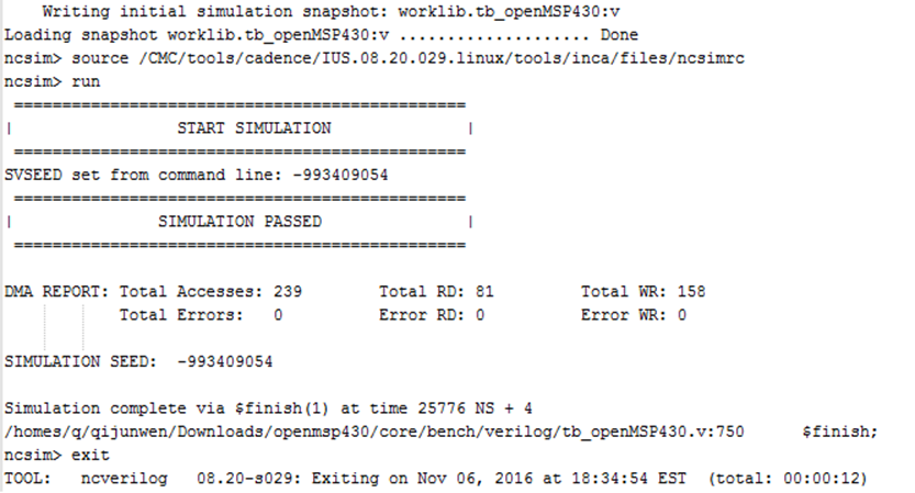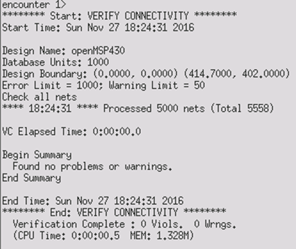OpenMSP430 has been implemented with IBM 0.13um technology using standard digital implementation methodology. Its functionality has been verified by running gate level simulation and confirmed timing clean on post-route netlist. DRC check passed with some acceptable waivers. However, due to the tool issues and time constraints, LVS hasn't been performed successfully in Cadence at this point. Figure 3-9 show all implementation results.