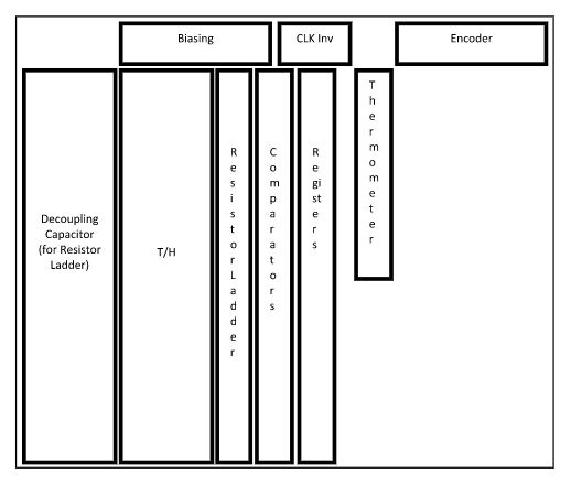 A resistor ladder is used to distribute the reference voltages ranging from 0.242 – 0.961V with VLSB of 11.3mV to the comparators. Decoupling capacitors (500fF each) are added on each reference node to reduce the noise coming from the comparators. The resistor ladder consumes about 67.55uW of static power. The layout is incorporated into the analog frontend layout of the Flash ADC. Details see Figure 14-15.