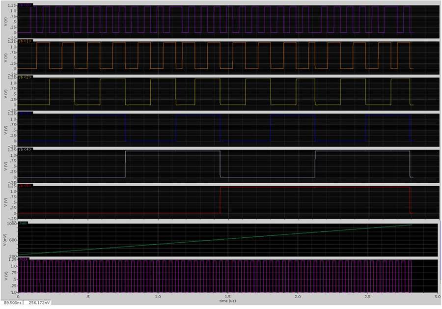 The maximum sampling rate of the ADC is 22MHz with a full scale input of 0.235 – 0.97V at a common mode input of 0.6V. The power consumption is about 20.09mW at 1.2V VDD and 22MHz input clock frequency. A transient simulation is performed at 22MHz clock frequency to show the correct operation of the ADC. Details see Figure 10-13.