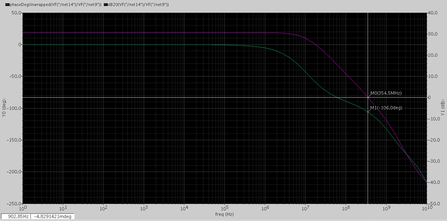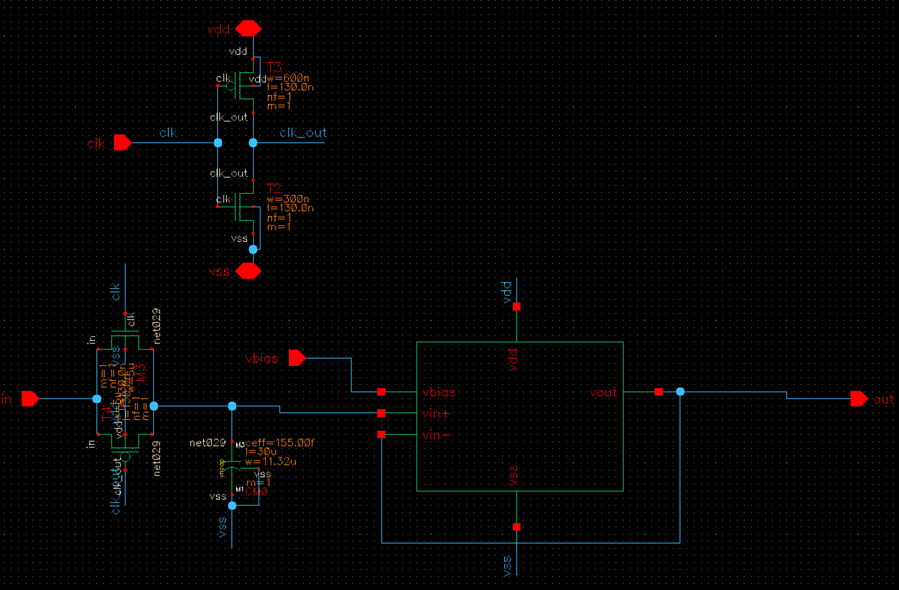 This circuit tracks the input voltage at clock running high and the op-amp buffers the voltage out to the comparator when the clock is low [2]. The maximum sampling rate is 350MHz which is the unity gain bandwidth of the op-amp. The power consumption is about 307.5uW at 22MHz clock without the biasing circuit. The circuit, layout and simulation are shown in Figure 16-21.