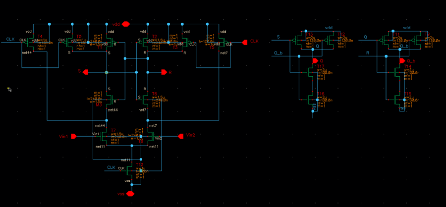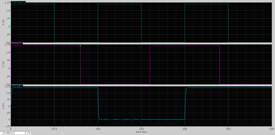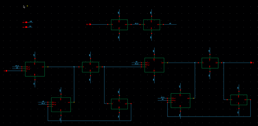 Registers are used after comparator and before thermometer and encoder, because the later stages – thermometer and encoder – are both asynchronous; that is any fluctuation in the analog input to the comparator might be captured in the final binary output. In order to stabilize the output of comparator, we used a register implemented by the master-slave flip-flop. The schematic, layout and simulation of this cell are shown in Figure 25-27.
