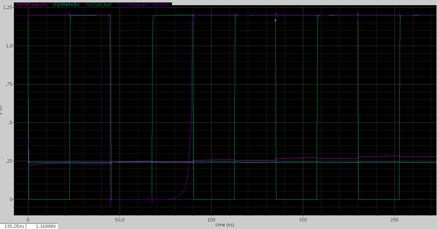 The strongArm comparator consumes zero static power and only 4.752uW of dynamic power at 22MHz [3]. The settling time of the comparator (22.5ns) at its threshold (0.235V) limits the maximum sampling rate of the ADC to 22MHz. The circuit, layout and simulation are shown in Figure 22-24.