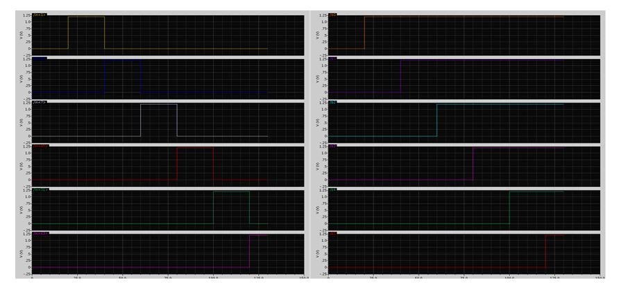 For each output bit of an encoder, 32 OR gates are utilized. Much effort was put into fitting the layout of an encoder slice into a rectangular shape. The schematic, layout and simulation of this cell are shown in shown in Figure 31-33.